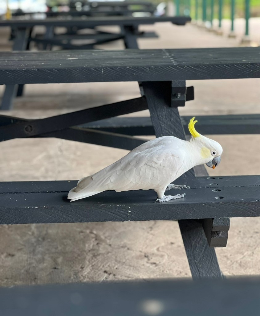 The animal that springs to mind in my community is the cockatoo, a native Australian parrot. I had seen some of these in Sydney but here in the Shire we have thousands of these, maybe as we’re close to the Royal National Park. These birds live in the wild, however, many can be seen here on the suburban streets in search for an easy meal. They are extremely rowdy and their squawk (I remembered how much I love this word) would frighten the life out of you. I have jumped out of my skin on numerous occasions as they let off their loud SQUAAAAAWWK, sometimes when flying over your head or even towards you!!!