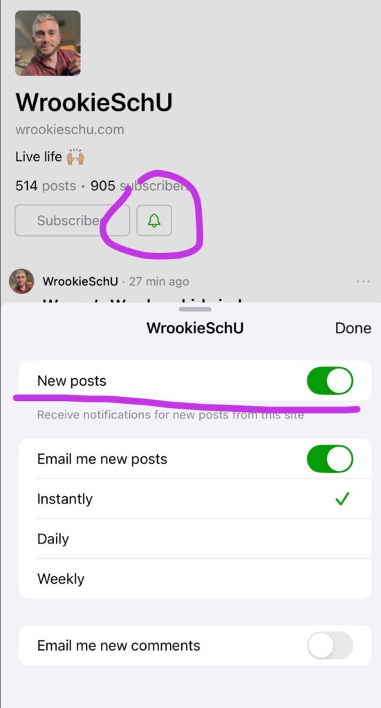 I went to my blog as an example (you can visit any blog) and clicked on the alarm bell. It then brought me this page where I can click on notifications for new posts FROM THE APP. I couldn’t believe my luck. Even though I had been subscribed by email, I was receiving no emails or notifications (even checked my junk email). I am delighted to say that now I can receive notifications if a new post from my favourite blogs has been posted. You have no idea how easy this will make it for me to keep up with new posts. I feel like I often become lost in a rabbit hole with where new posts are or when they were published.